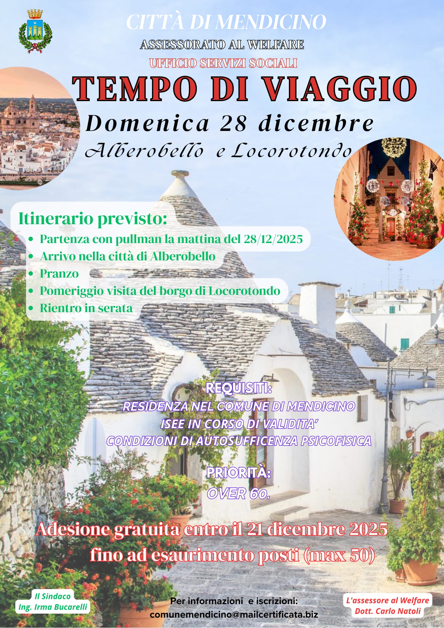 Il Comune di Mendicino promuove una gita sociale gratuita finalizzata al contrasto dell’emarginazione e al potenziamento dell’integrazione sociale, nell’ambito delle misure FELS 2025. Disponibili 50 posti. Scadenza domande: 21 dicembre 2025.