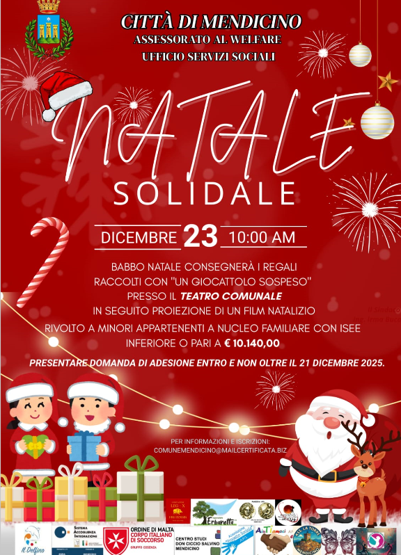 Il Comune di Mendicino promuove il progetto “Natale Solidale 2025”, un’iniziativa rivolta ai minori appartenenti a nuclei familiari in condizioni di povertà , finalizzata a favorire l’inclusione sociale e il contrasto alla povertà educativa.