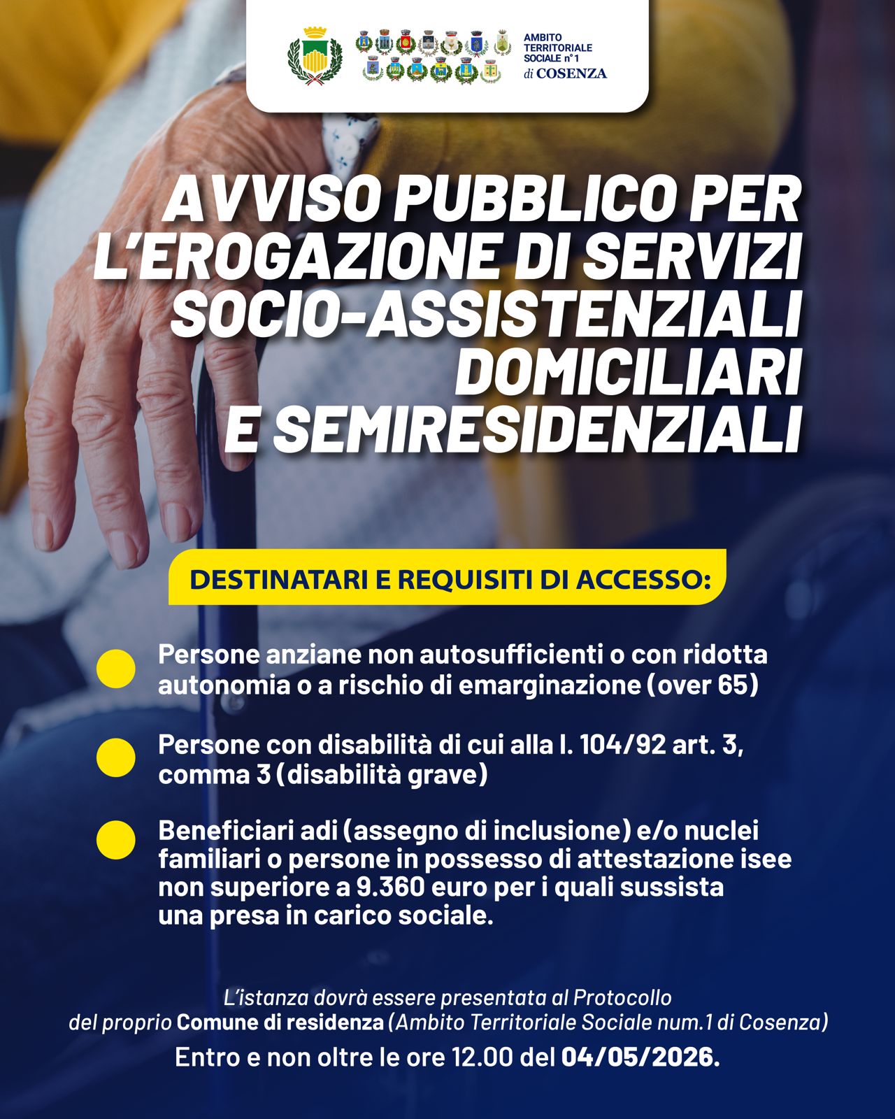 Avviso pubblico ATS 1 Cosenza: al via le domande per i servizi socio-assistenziali domiciliari e semiresidenziali per anziani, persone con disabilità e nuclei in condizioni di fragilità (scadenza: 4 maggio 2026, ore 12:00).